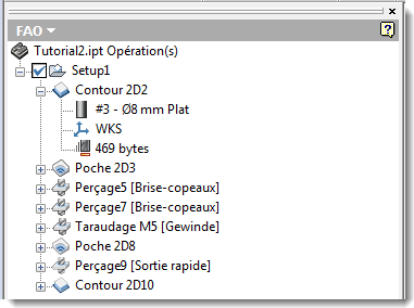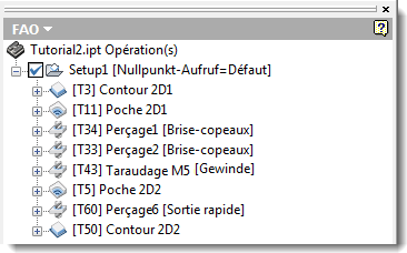 Le navigateur FAO est l'espace réservé à toutes vos trajectoires d'outil. Toutes les trajectoires d'outil sont organisées dans des dossiers de configuration qui en décrivent la configuration physique (par exemple, le système de coordonnées). Un programme complet est composé d'au moins une opération qui contient la trajectoire d'outil générée réelle (informations d'emplacement de l'outil). Pour des configurations plus complexes, il peut être utile d'organiser les opérations en sous-dossiers.