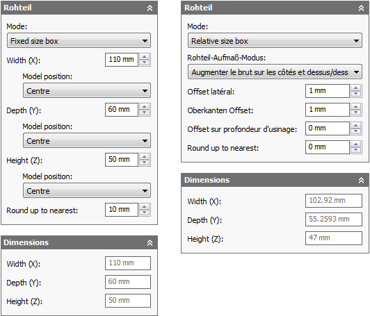 Cube à taille relative : crée un corps de brut cubique qui est plus grand que le modèle selon des valeurs de décalage données, arrondies à l'incrément indiqué le plus proche.