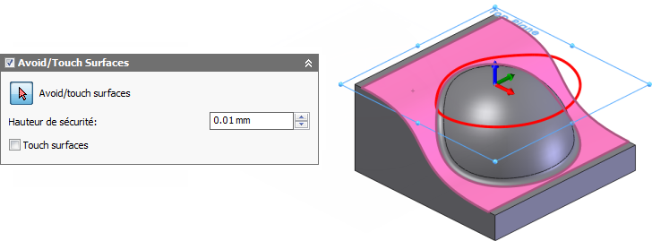 Vous pouvez inverser la signification de l'option Surfaces à éviter en cochant la case Surfaces à toucher. Lorsque cette option est activée, les surfaces d'évitement désignent les surfaces à toucher dans les limites de la hauteur de sécurité tandis que les surfaces restantes sont à éviter.