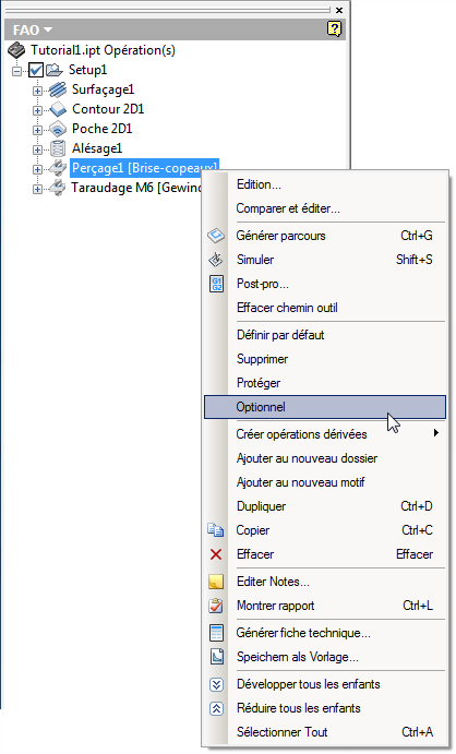 Pour rendre une opération facultative, cliquez avec le bouton droit de la souris sur l'opération dans le navigateur FAO et sélectionnez Optionnel dans le menu contextuel. Vous pouvez de nouveau rendre l'opération obligatoire en sélectionnant Optionnel encore une fois.