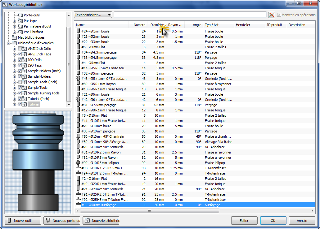 Vous pouvez trier les outils répertoriés dans la bibliothèque d'outils en cliquant sur les colonnes de champ. Par exemple, si vous souhaitez trier les outils répertoriés en fonction de leur diamètre, cliquez simplement sur la colonne Diamètre. Si vous cliquez sur la colonne à deux reprises, vous passez de l'ordre croissant à l'ordre décroissant.