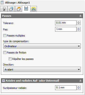 Dans le cadre des opérations de finition, la valeur par défaut est égale à 0 mm/0 po ; autrement dit, aucune quantité de matière n'est conservée.