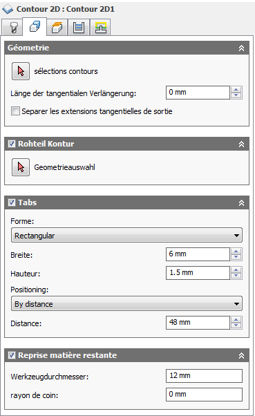 Vous pouvez ajouter des onglets à la trajectoire d'outil Contour 2D pour bien maintenir la pièce de travail tandis que la matière restante est usinée. Les onglets sont très utiles lors de la coupe de plastique ou de matériaux en bois fin à l'aide de fraiseuses à détourer 2D.