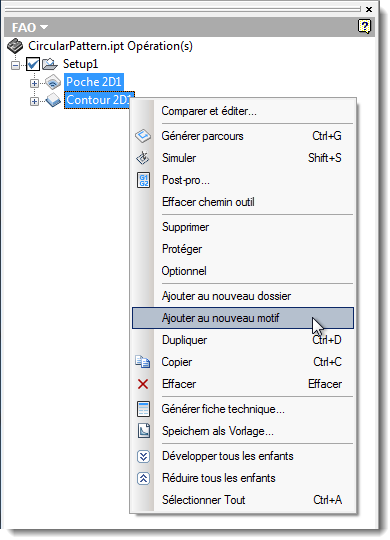 Pour créer un motif de trajectoire d'outil, vous devez d'abord sélectionner les opérations dont vous souhaitez créer le motif ou que vous souhaitez dupliquer dans le navigateur FAO, puis cliquez avec le bouton droit de la souris et sélectionnez Ajouter au nouveau motif dans le menu contextuel.