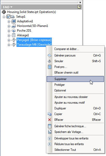 Les opérations Drill1 et Tapping M6 masquées apparaissent grisées