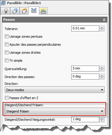 L'utilisation de stratégies telles que Bi-Tangent, Crête constante, Parallèle, Radial et Spirale génère des trajectoires d'outil qui se déplacent vers le haut et vers le bas en Z. Selon les outils utilisés, vous pouvez préférer ne pratiquer qu'un fraisage vers le bas ou vers le haut. Inventor HSM Express vous permet de contrôler cette fonction dans l'onglet Passes avec le menu déroulant Fraisage vers le haut/bas.
