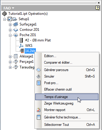 Affichage du temps d'usinage pour une trajectoire d'outil sélectionnée