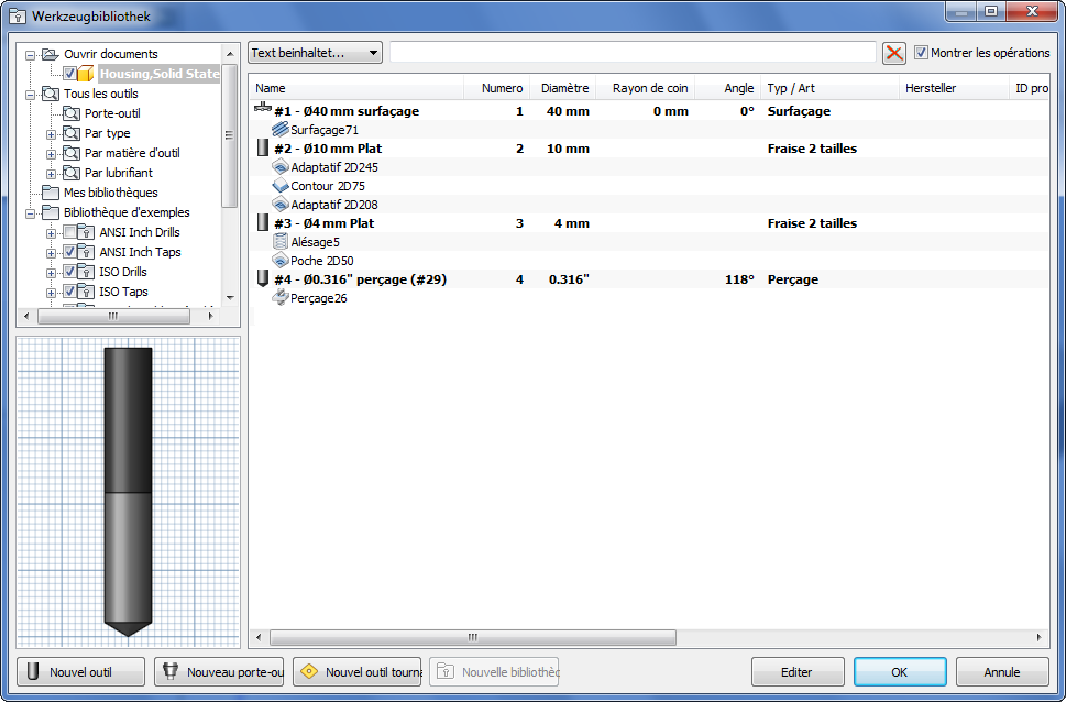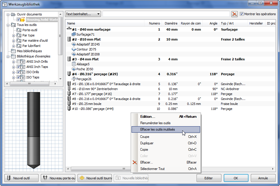 Lors de la réalisation d'une tâche, il est fréquent de définir plusieurs outils et de les tester afin d'obtenir le résultat souhaité pour l'opération sélectionnée. Après avoir terminé toutes les opérations d'usinage d'une pièce, vous pouvez trouver de nombreux outils, dans la bibliothèque d'outils du document actif, qui ne sont pas affectés à une opération (des outils inutilisés).