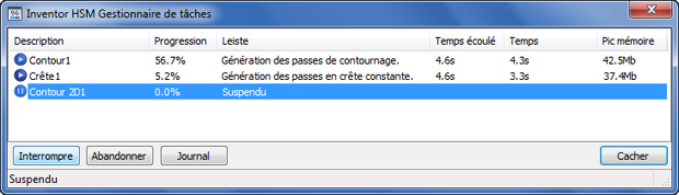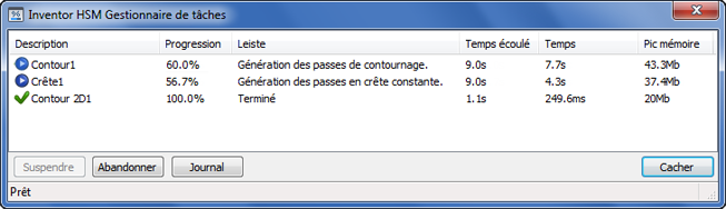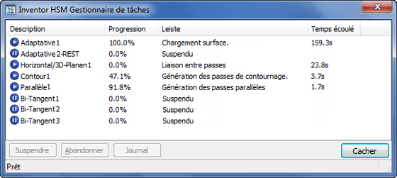 Inventor HSM Express vous permet de continuer à travailler dans Inventor pendant la génération de trajectoires d'outil en arrière-plan. L'interface principale pour le contrôle de la génération de trajectoires d'outil est le gestionnaire de tâches Inventor HSM Express .