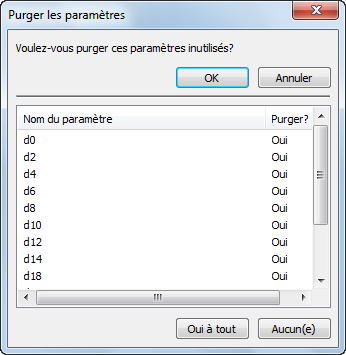 Dans la partie inférieure de la boîte de dialogue Paramètres, l'option Purger les éléments non utilisés répertorie tous les paramètres inutilisés dans une fenêtre distincte. Vous pouvez les purger en une seule opération. Cliquez sur Oui à tous pour supprimer tous les paramètres inutilisés dans le document ou sur Non à tous pour conserver les paramètres inutilisés dans le document actif.