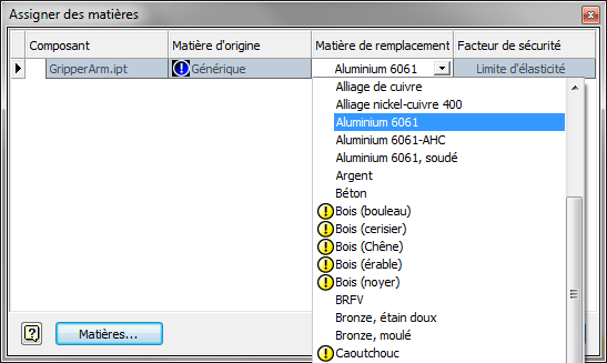 Avec le générateur de formes, les propriétés des matières doivent être affectées afin de définir les caractéristiques structurelles de votre pièce.