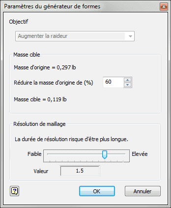 Les paramètres du générateur de formes permettent de définir une réduction de la masse cible et la résolution de maillage.