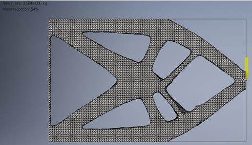 La différence majeure que l'on observe avec le générateur de formes est la matière restante au niveau de l'extrémité fixe (gauche) de la poutre. Etant donné qu'une condition aux limites a été appliquée à cet emplacement, la matière figurant sur cette face a été automatiquement conservée. Les faces comportant des contraintes et des charges appliquées seront automatiquement conservées lors de l'exécution du générateur de formes.