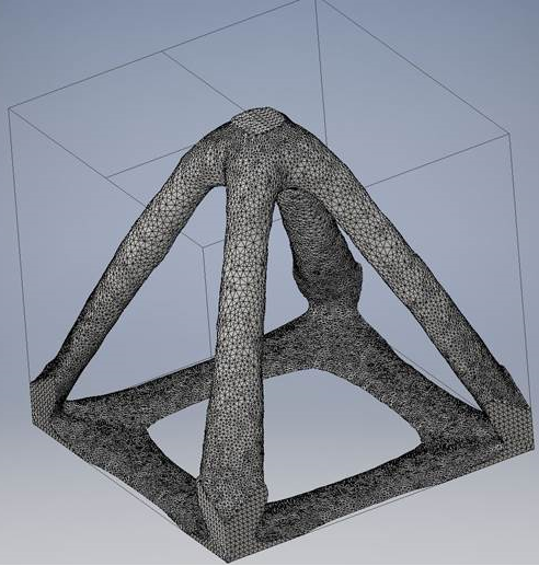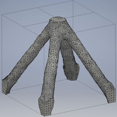 Le générateur de formes nous permet de reproduire un résultat très similaire au cas (b), dans lequel le diamètre minimum du membre est défini sur 2. Actuellement, le générateur de formes n'impose pas une taille de membre minimum. Pour générer une pièce comportant des membres fins, vous devez utiliser un maillage d'une résolution plus élevée, comme illustré ci-dessous.