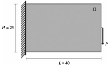 Dans ce problème, une poutre cantilever (L = 40, H = 25, l = 1) est chargée par une charge concentrée agissant sur l'extrémité libre de la poutre. La charge concentrée est appliquée au milieu de la poutre et jusqu'à l'extrémité libre de celle-ci. La poutre est constituée d'une matière isotrope avec un module de Young de 106 et un coefficient de Poisson de 0,25.