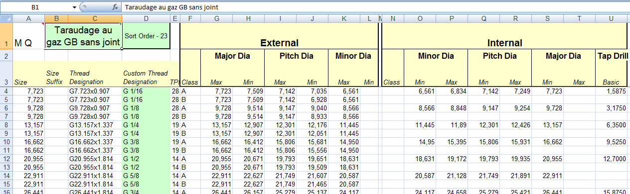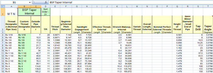 La feuille de calcul Thread.xls contient plusieurs feuilles de calcul dans l'un des deux formats : type de filetage parallèle ou type de filetage conique. La feuille de calcul contient des types de filetage et des tailles de perçage taraudé normalisés. Vous avez la possibilité de modifier les feuilles de calcul pour :