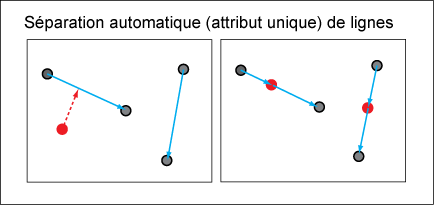 Vous pouvez sélectionner ou effacer ces deux situations individuellement à l'aide des cases à cocher de pré/post mise à jour (le point est déplacé) et de pré/post insertion (le point est inséré). Après une séparation avec attribut unique, les deux nouvelles lignes partagent le même objet attribut.