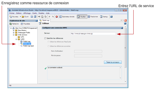 - Sur la barre d'outils d'Autodesk Infrastructure Studio, cliquez sur Enregistrer pour stocker cette ressource de connexion dans le référentiel.