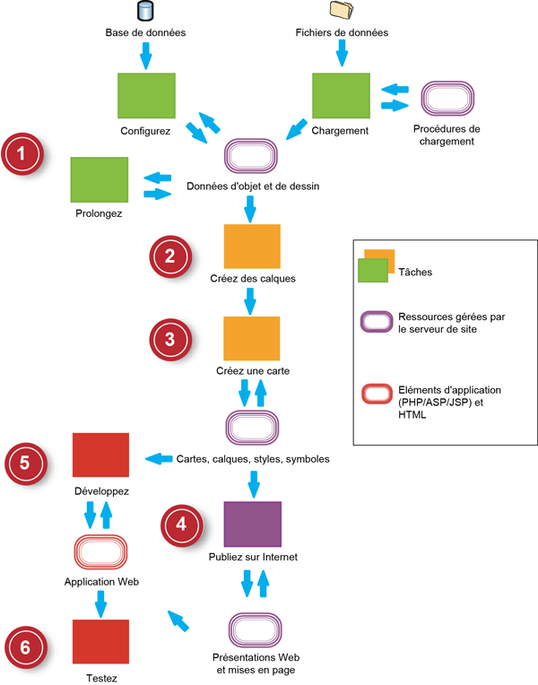 Le diagramme de la page ci-contre illustre le processus de développement d'une application Web à l'aide d'Infrastructure Map Server. Dans ce diagramme, les rectangles représentent les tâches, les formes ovales les entités qui sont créées par les tâches ou utilisées par celles-ci, tandis que les flèches indiquent le flux des données. Vous pouvez décomposer le processus de développement en cinq phases (il est possible d'ajouter une phase de planification et de préparation qui ne figure pas dans ce diagramme) :