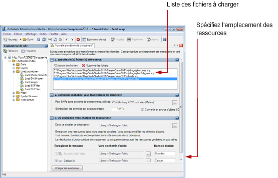On suppose dans cette procédure que les fichiers .shx et .dbf requis se trouvent dans le même dossier que les fichiers .shp. Pour charger un fichier de formes, faites glisser le fichier source vers l'explorateur de site. Autodesk Infrastructure Studio crée automatiquement un calque, ainsi qu'une source d'objets.