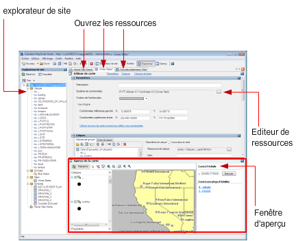 Vous pouvez ouvrir plusieurs ressources dans le volet de l'éditeur. Chaque ressource dispose de son propre éditeur. Le nom de la ressource apparaît sur un onglet dans la partie supérieure de l'éditeur. La barre d'outils située dans la partie supérieure gauche de la fenêtre du programme contient des outils pour l'explorateur de site et les autres éditeurs. Cliquez avec le bouton droit de la souris sur un site, un dossier ou une ressource pour choisir des options supplémentaires.