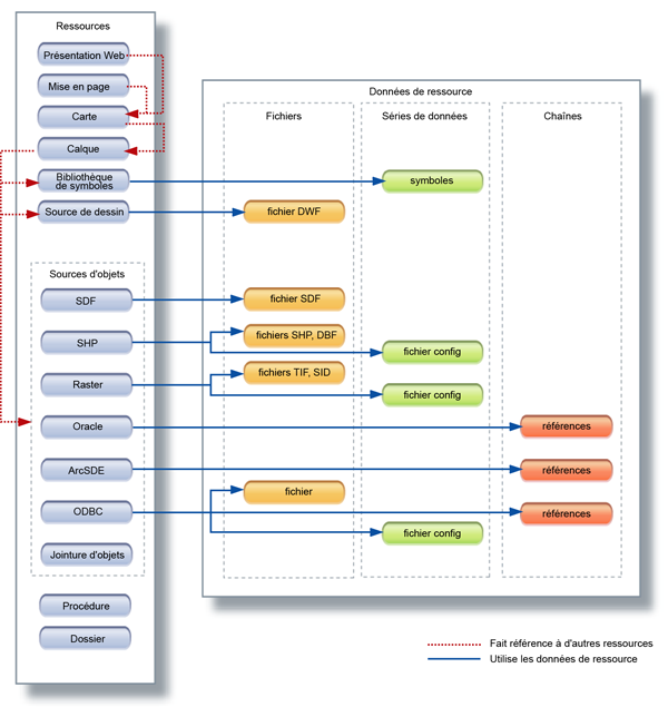 Les ressources sont conçues pour être réutilisées et partagées. Certaines ressources font référence à d'autres ressources. Par exemple, les cartes et les calques sont stockés sous forme de ressources distinctes, chaque carte faisant référence aux calques qu'elle contient. Les calques font référence à des sources d'objets ou de dessin. Lorsque vous mettez à jour la source d'objets d'origine, le calque est automatiquement mis à jour.