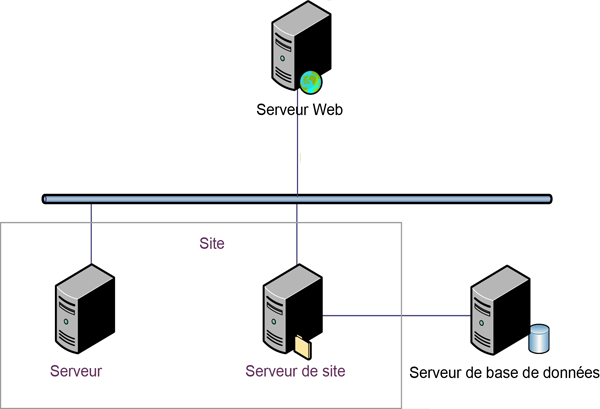 Dans le diagramme, le site contient deux serveurs, l'un d'entre eux étant désigné comme le serveur du site. Le serveur du site contient le référentiel des ressources. Il permet également l'établissement de connexions à tout serveur ou serveur de base de données.