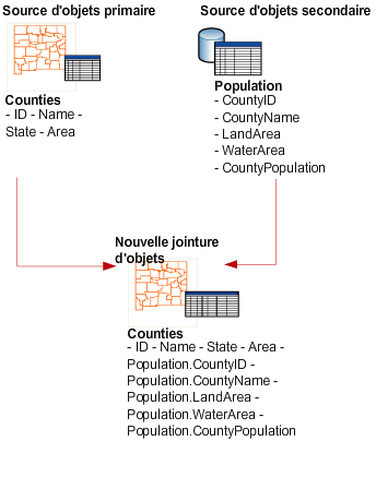 L'illustration ci-dessous montre un exemple d'association d'une source d'objets contenant des frontières d'état ou de comté à une autre source d'objets contenant des données de recensement de la population.