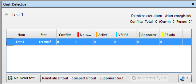 Un résumé du test de conflit actuellement sélectionné s'affiche toujours en haut de la fenêtre Clash Detective. Le nombre total de conflits dans le test s'affiche avec des détails concernant les conflits ouverts (Nouveau, Activé, Vérifié) et fermés (Approuvé, Résolu). Si un test de conflits est modifié après sa configuration (il peut s'agir, par exemple, de la modification d'une option ou du chargement de la dernière révision du modèle), un message d'avertissement s'affiche pour indiquer que les résultats risquent de ne pas refléter le dernier modèle ou les derniers paramètres. Cliquez avec le bouton droit sur cette icône pour relancer le test.