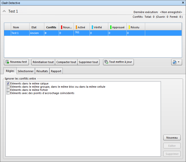 La fenêtre ancrable Clash Detective permet de définir les règles et les options de recherche de conflits, de voir les résultats, de les trier et de produire des rapports sur les conflits.