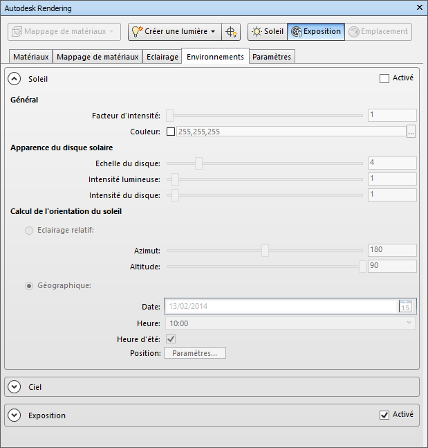 Utilisez l'onglet Environnements pour utiliser les propriétés du soleil et du ciel, et configurer les paramètres d'exposition.