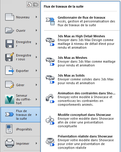 Le produit source varie en fonction de la suite : il peut s'agir d'AutoCAD, d'Inventor ou de Revit. Le produit cible correspond toujours à 3ds Max ou Showcase. Les flux de travail fournis peuvent varier en fonction du niveau de la suite (Standard, Premium ou Ultimate). Les utilisateurs professionnels disposant de licences eFlex ou d'abonnements Term Multi-Flex sont autorisés à utiliser tous les flux de travail.