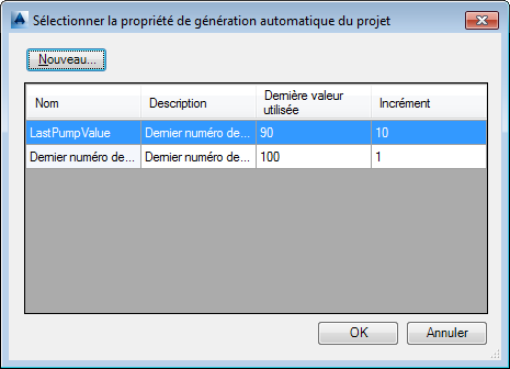 - Dans la boîte de dialogue Sélectionner la propriété de génération automatique du projet, cliquez sur Nouveau.