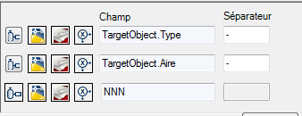 Conseil : Utilisez autant de propriétés que nécessaire comme sous-pièces. Utilisez des séparateurs uniquement entre ces sous-pièces, pas à l'intérieur de celles-ci. Des séparateurs apparaissent entre les sous-pièces d'une étiquette si vous les spécifiez dans la zone Séparateur. Si vous entrez un tiret entre des éléments de la zone Champ (p. ex. N-N-N), les résultats obtenus peuvent être inattendus.