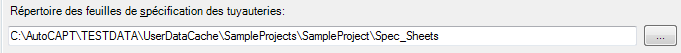 Dans la zone Répertoire des feuilles de spécification des tuyauteries du volet Chemins, entrez le chemin d'accès de l'emplacement de vos fichiers de spécification des tuyauteries ou cliquez sur le bouton [...] pour rechercher et sélectionner cet emplacement.