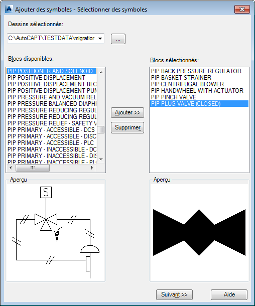 - Dans la boîte de dialogue Ajouter des symboles - Sélectionner des symboles, attribuez chaque bloc à un composant et donnez-lui un nom. A mesure que vous progressez dans la liste, les symboles attribués sont grisés. Procédez comme suit :