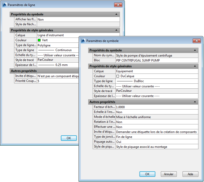 Pour les composants comme pour les lignes, vous pouvez définir des propriétés graphiques générales telles que les calques, les couleurs, les types de lignes schématiques et les épaisseurs de ligne.