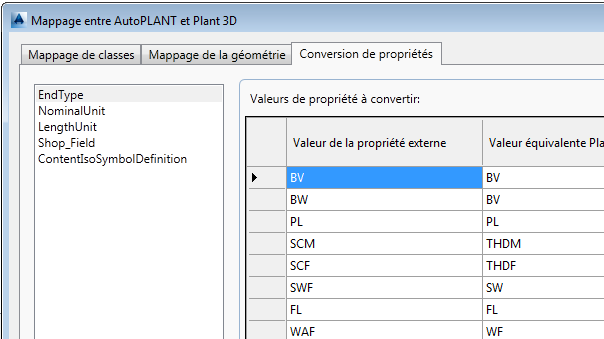 Par exemple, la valeur BW de la propriété de type de fin de ligne AutoPLANT est mappée avec (convertie en) BV dans le langage de Plant 3D.