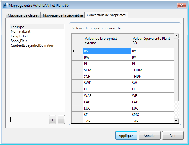 Spécifie la valeur équivalente Plant 3D de la propriété sélectionnée dans la liste de gauche. Dans la boîte de dialogue affichée.