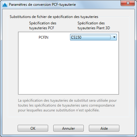 Dans le cas où les fichiers de spécification des tuyauteries du projet en cours ne correspondent pas au fichier PCF, vous pouvez désigner une spécification des tuyauteries Plant 3D de substitut.