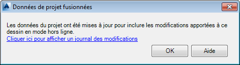 Cette boîte de dialogue s'affiche lorsque vous ouvrez un dessin qui a été modifié en dehors du projet. Elle s'affiche également si vous récupérez un dessin ou restaurez une sauvegarde d'un dessin.