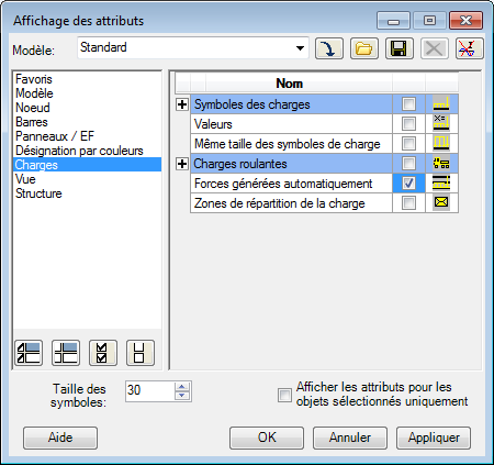 Dans la boîte de dialogue Affichage des attributs, sélectionnez Charges, puis Forces générées automatiquement, comme indiqué ci-dessous. Cliquez sur OK.