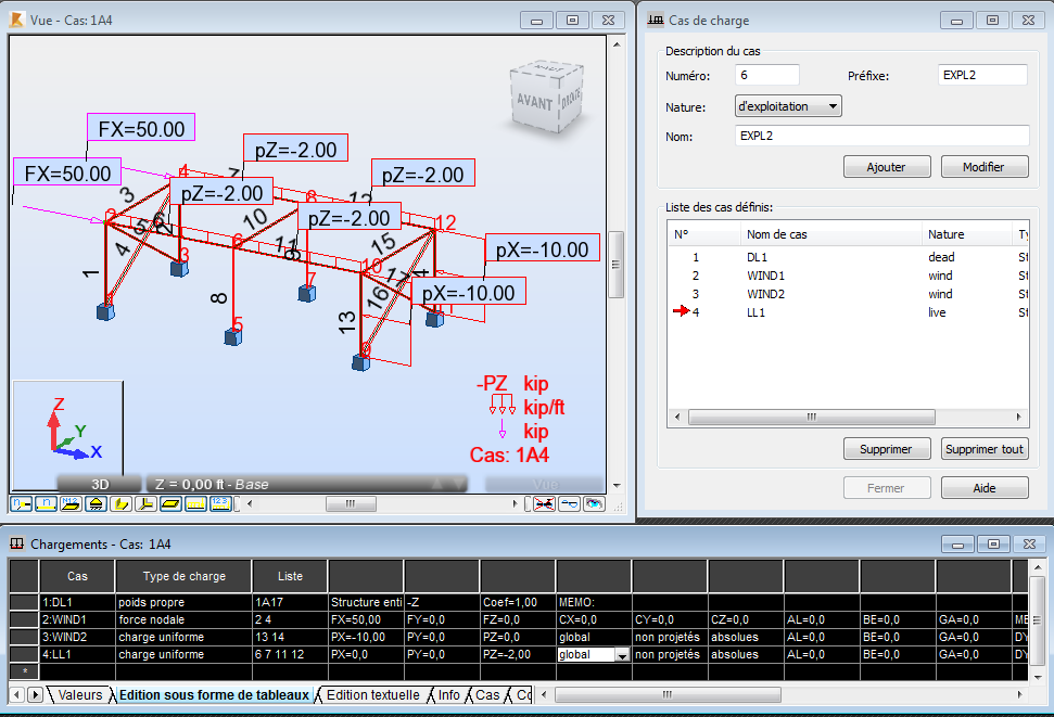La charge WIND2 s'affiche dans la zone de dessin et dans le tableau des cas de charges.