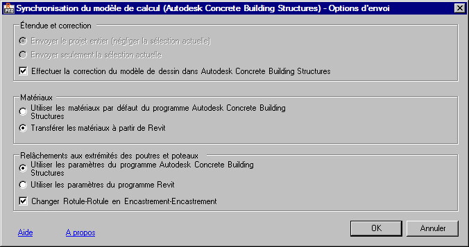 - Dans la boîte de dialogue Synchronisation du modèle de calcul (Autodesk Concrete Building Structures) - Options d'envoi, spécifiez les options de transfert :