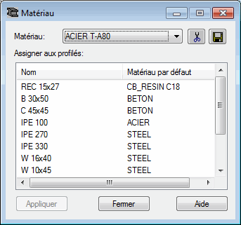 Dans la partie supérieure de la boîte de dialogue Matériau, la liste des matériaux disponibles est affichée. Au dessous de cette liste, la liste de sections est affichée ; Les deux colonnes de cette liste contiennent les noms des sections définies et le matériau qui leur a été affecté. La liste de la boîte de dialogue Matériau est identique à celle affichée dans la boîte de dialogue Sections.