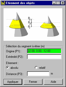 - Dans la boîte de dialogue, définissez les coordonnées du segment à étirer. Dans les champs Origine (P1) et Extrémité (P2), définissez les coordonnées des points déterminant la surface de l'objet à étirer. Cette zone est comprise entre deux plans (qui passent par l'origine et l'extrémité) perpendiculaires au segment. En dehors de cette surface, les objets ne sont pas modifiés.