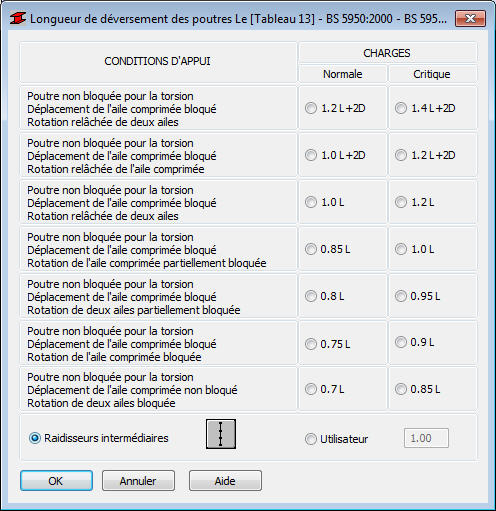 La boîte de dialogue affiche le tableau table 13 inclus dans la norme BS5950: 2000.