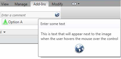 Most controls can have a tooltip set (using the ToolTip property) which is displayed when the user moves the mouse over the control. When the user hovers the mouse over a control for an extended period of time, an extended tooltip will be displayed using the LongDescription and the ToolTipImage properties. If neither LongDescription nor ToolTipImage are set, the extended tooltip is not displayed. If no ToolTip is provided, then the text of the control (RibbonItem.ItemText) is displayed when the mouse moves over the control.