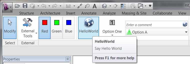 There are three types of buttons you can add to a panel: simple push buttons, drop-down buttons, and split buttons. The HelloWorld button in Figure 14 is a push button. When the button is pressed, the corresponding command is triggered.