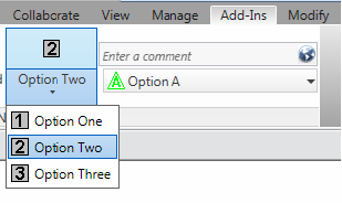 Initially, the push button will be the top item in the drop-down list. However, by using the IsSynchronizedWithCurrentItem property, the default command (which is displayed as the push button top half of the split button) can be synchronized with the last used command. By default it will be synched. Selecting Option Two in the split button from Figure 14 above yields: